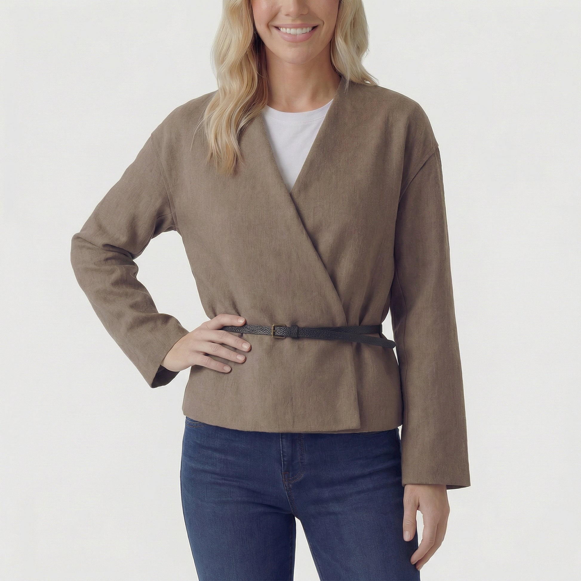 Die Arvenia Damenjacke besticht durch ihre moderne, minimalistische Optik und eine elegante Wickel-Silhouette. Der tiefe V-Ausschnitt und der feine Bindegürtel setzen stilvolle Akzente und verleihen der Jacke eine vrouwelijke, zeitlose Ausstrahlung, die sich ideal für Alltag und besondere Anlässe eignet.
