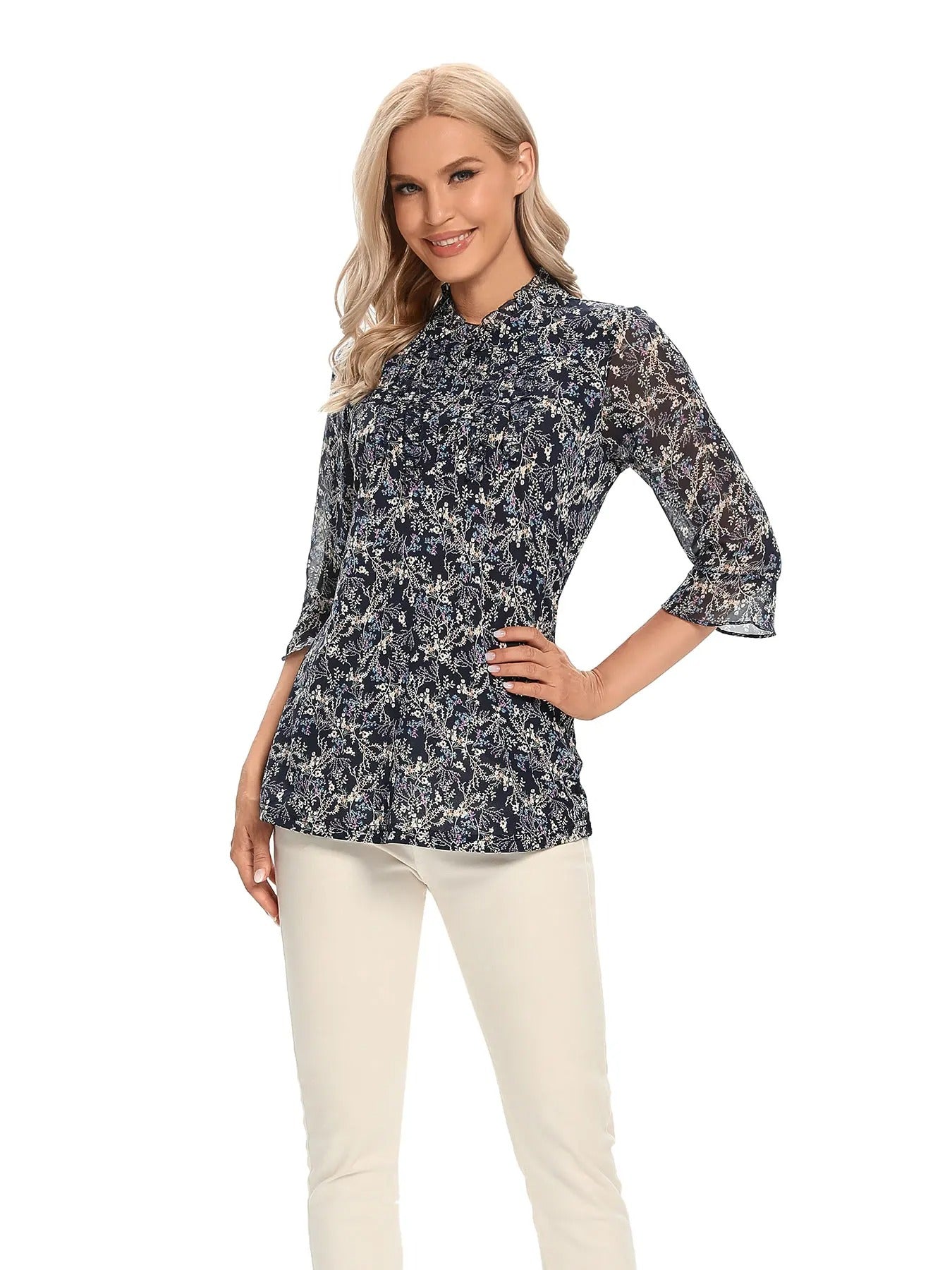 Die Elanora Damenbluse überzeugt mit ihrem eleganten, floralen Muster und einer femininen, zeitlosen Ausstrahlung. Der dezente Stehkragen mit feinen Rüschen verleiht der Bluse einen stilvollen Akzent und macht sie ideal für Alltag und Büro.