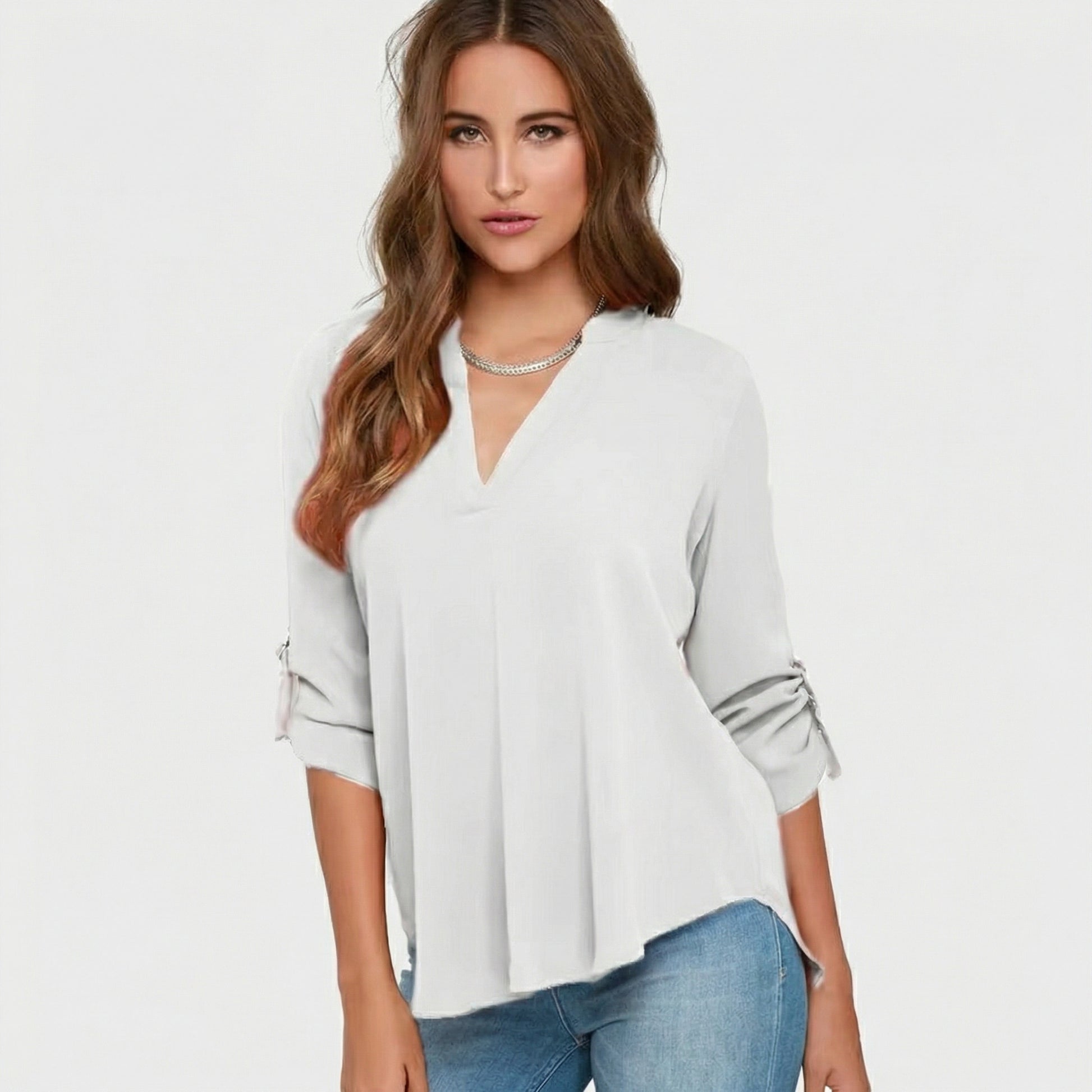 Das Elinora Langarmshirt überzeugt mit seinem modernen Design und einer vrouwelijke, elegante uitstraling. Der subtiele V-Ausschnitt und die soepele stof sorgen für einen femininen Look, der sich sowohl casual als auch etwas schicker tragen lässt.